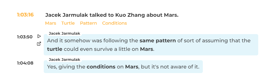 - If you are in the Transcript view then it will scroll to the given time in transcript, and it will highlight the word at that time.