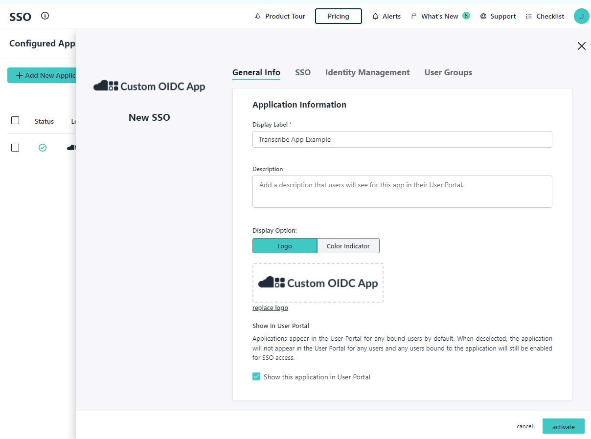 On the General Info we enter the name and you can choose to show it on the JumpCloud User portal: