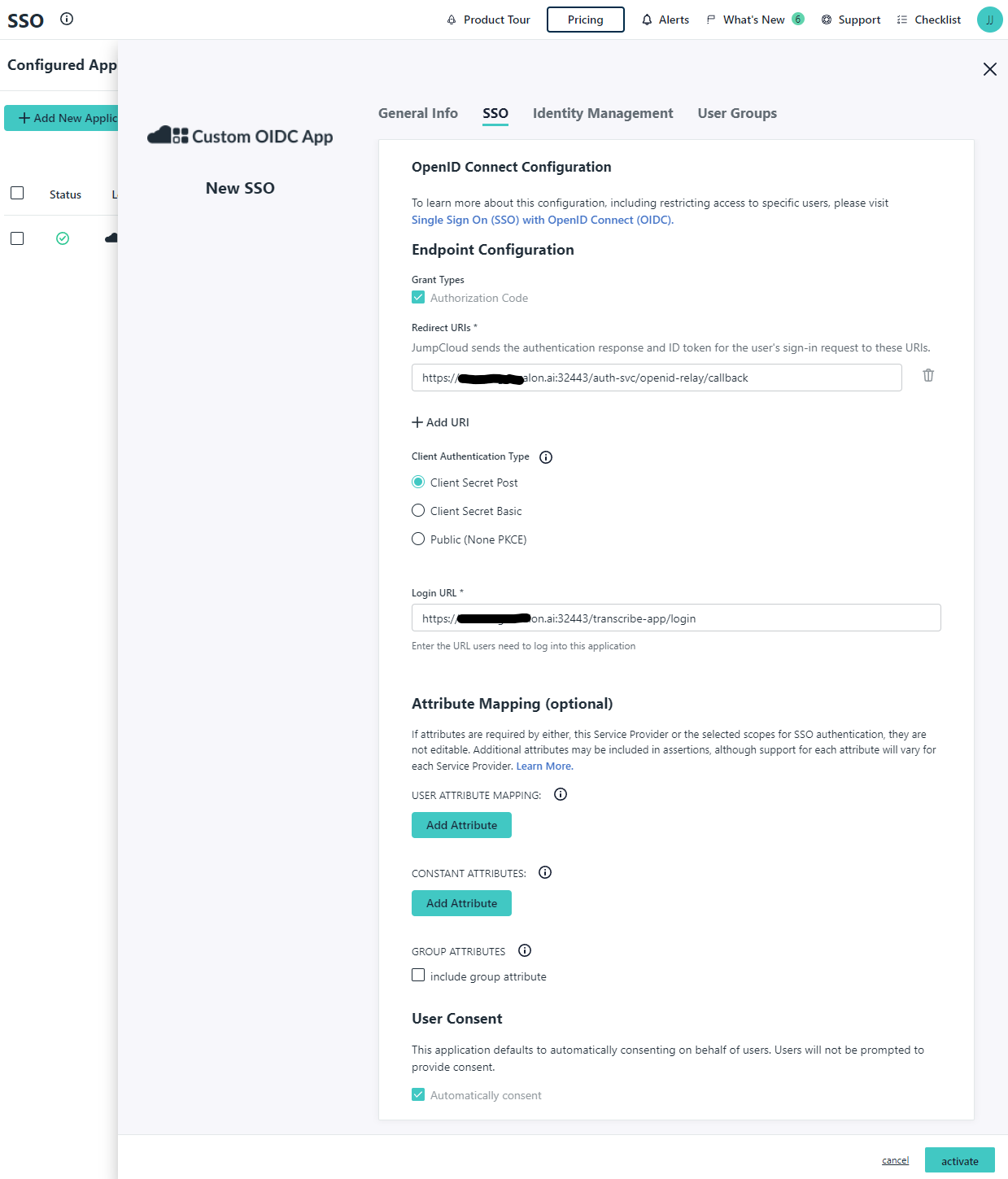 Configuration is relatively simple and consists of configuring the Identity Provider (e.g, JumpCloud) and entering a few settings in the OIDC SSO form in the Transcribe App.