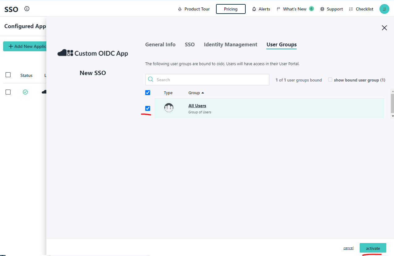 On the User Groups tab we select user groups that should have access to the Transcribe App, and we click Activate:
