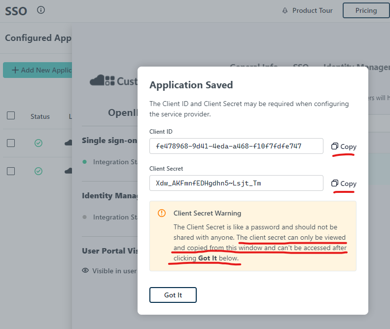 After clicking Activate we will get the Client ID and Client Secret values. We will need them to enter into the Transcribe App.