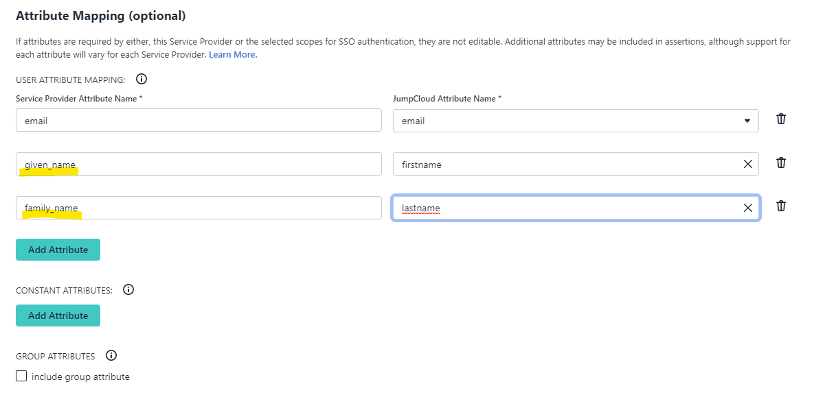 We also need to specify Attribute mapping for email, given_name, and family_name: